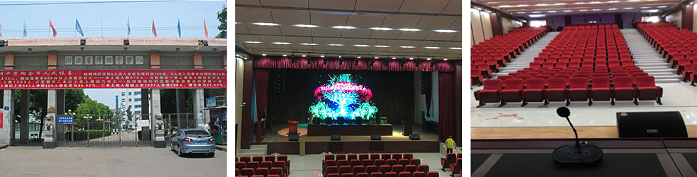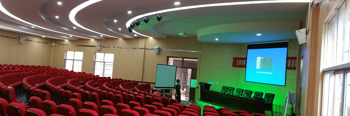 此場地共460平方,打造成為樟樹二中會議報告廳,主要用途為平時教職工開會,學校文藝匯演等較大型的會議、活動。由于場地比較大,要達到室內聲場分布均勻的效果,必須選擇聲壓大,射程遠的線陣列音響產品作為主擴聲音箱,再輔以專業(yè)舞臺返聽音箱、臺唇音箱等,構成一套完美的音響擴聲系統(tǒng)。